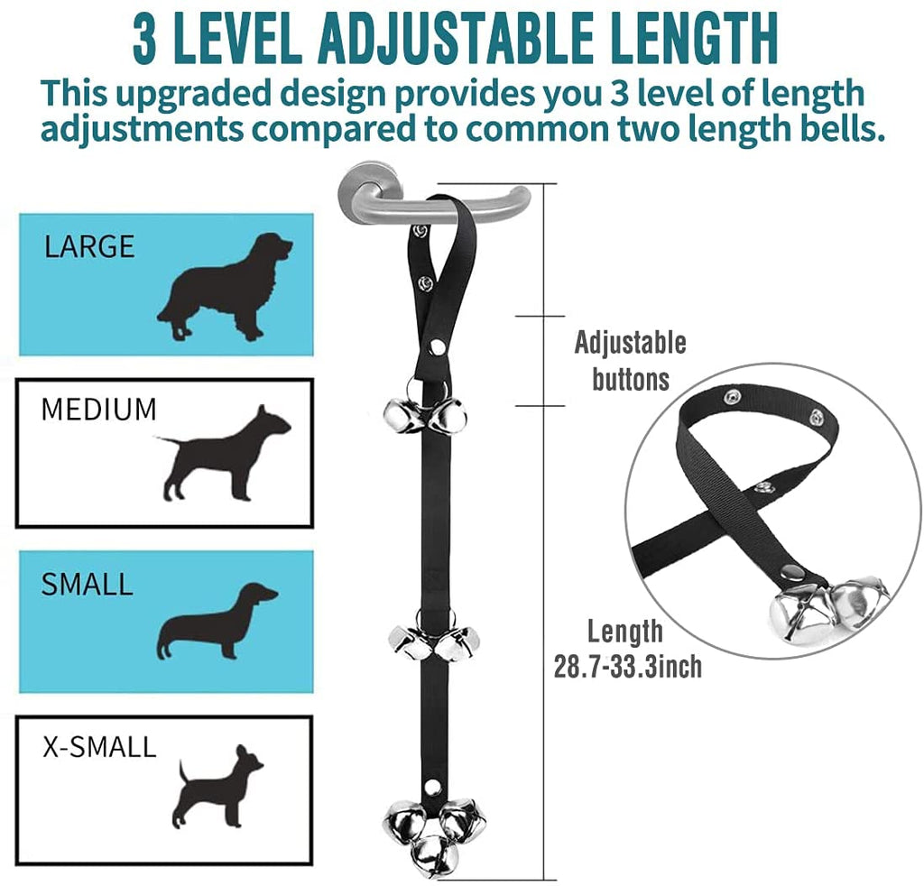 π 3 LEVEL ADJUSTABLE LENGTH - This upgraded design provides you 3 levels of length adjustments compared to common two-length bells. This allows for easy adjustment of the length to the bottom of the door or wall based on the size of your dog or the height of your door. design is easily mounted and can be hung at any level to accommodate pups of all heights.