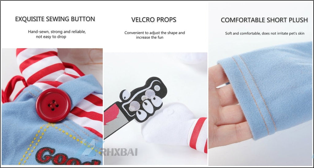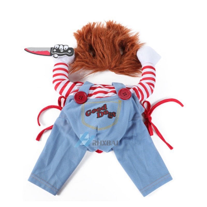 with this Halloween Costume for your Pup! This half coat and hood is a comfy fit for your pup and has the decorations of a delightful toy doll... except for that slightly suspicious knife he's wielding.Β We're pretty sure that's just to help you cut up the bacon bits, though!Β Β